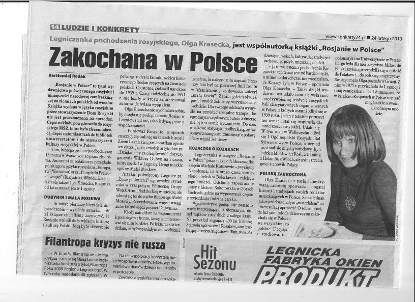 Я хочу рассказать о феномене города Легницы. На протяжении почти полувека этот город был советско-российско-польский. Послевоенный период, который принято называть советским, – в последнее время не популярный. Вот уже 35 лет я живу в Легнице, в городе, с 1945 вплоть до 1993 года, дислоцировались советские войска. Дружба, отношения личного и официального характера, история последних лет перед выводом советских войск и сам вывод, истории жизней многих советских людей разных по национальности, не только русских, моих друзей прошла у меня на глазах. С тем периодом у меня связаны самые тёплые воспоминания. Я думаю, не только у меня. Многие легничане-поляки с симпатией и теплом вспоминают своих советских друзей. Этот период невозможно выбросить из памяти и нашей истории, и истории Легницы также. Поэтому этот советский период также оказался в нашей книге – „Русские в Польше”. Я старалась показать, как тот период повлиял на современную жизнь города, как события тех лет отразились в судьбах современных людей и самой Легницы.